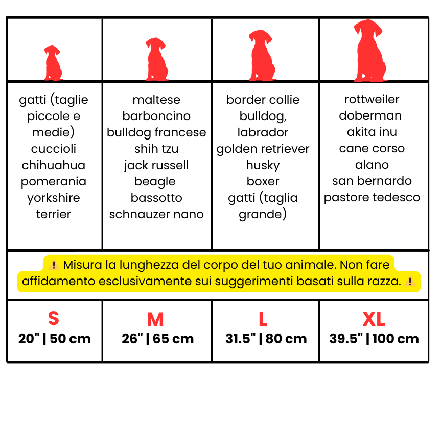 Anche se la nostra guida alle taglie aiuta la maggior parte dei clienti a trovare subito la misura perfetta, sappiamo che ogni animale è unico.